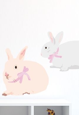 est composé de trois lapins : un rose, un blanc, un gris. Tous les trois portent autour de leur cou un noeud rose. Ce stickers sera imprimé sur un vinyle adhésif et découpé à la forme dans notre propre atelier en France. Création par
